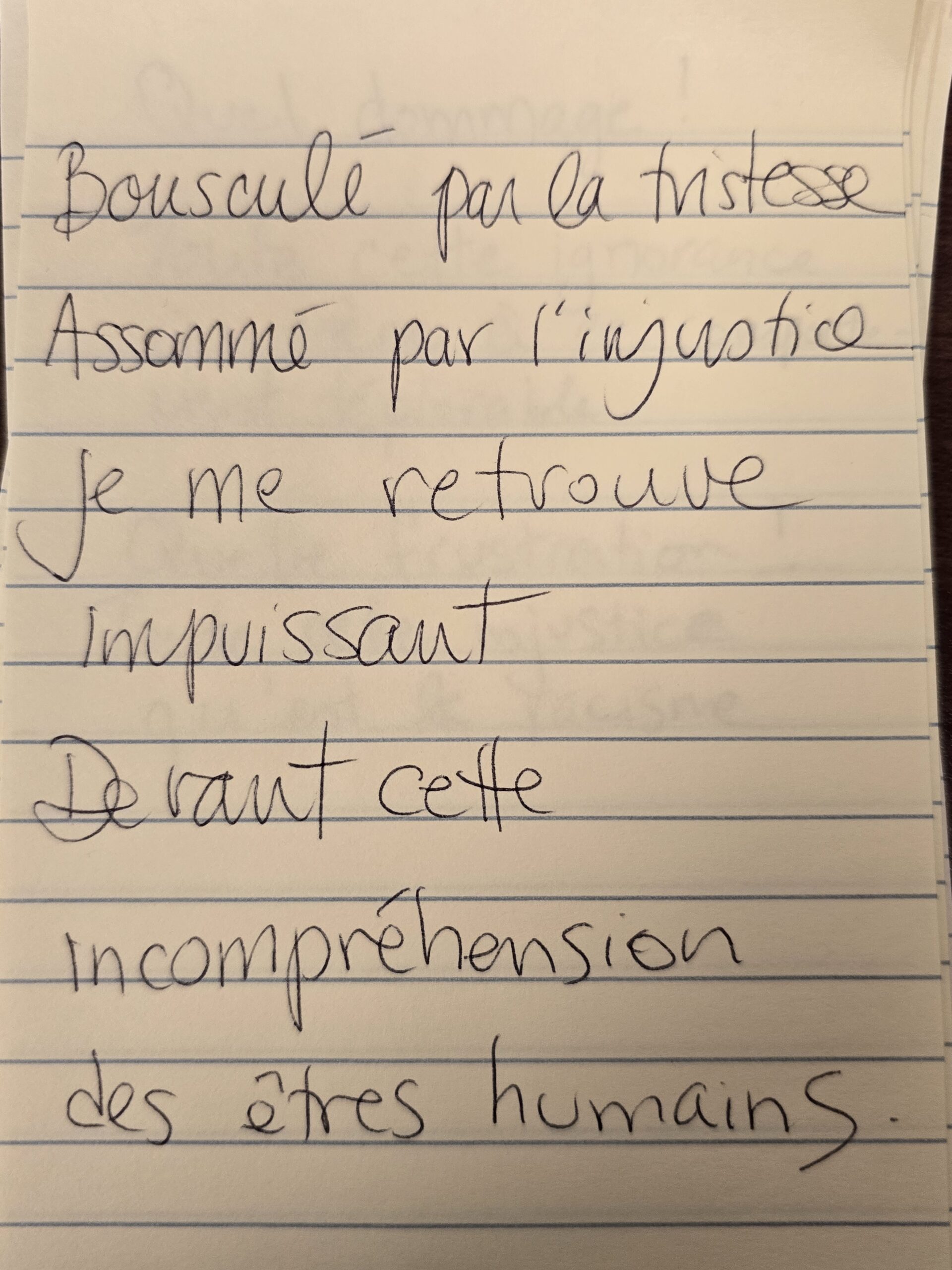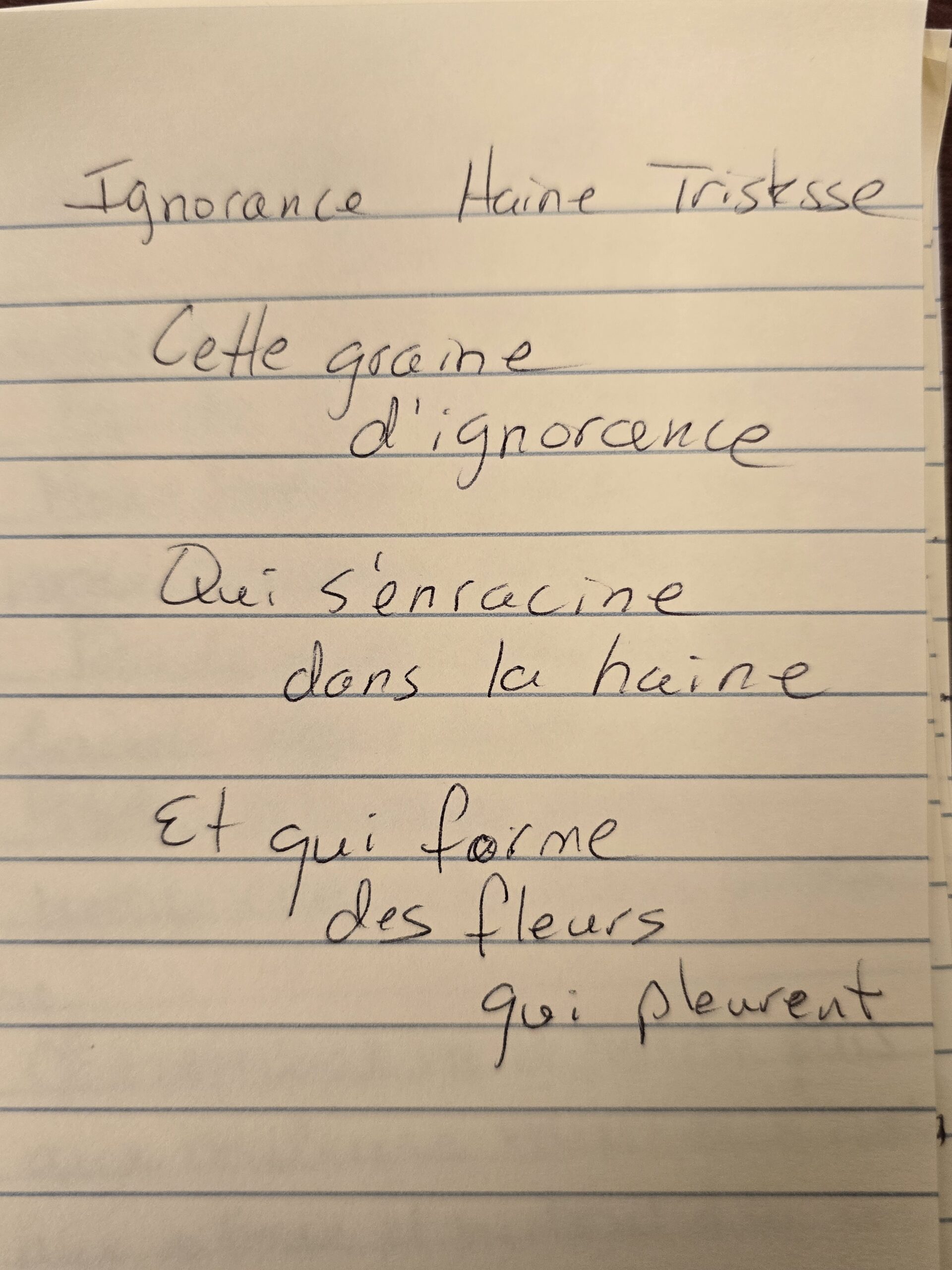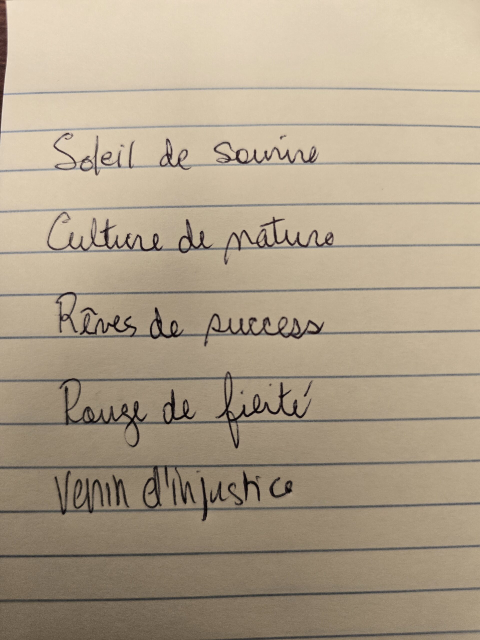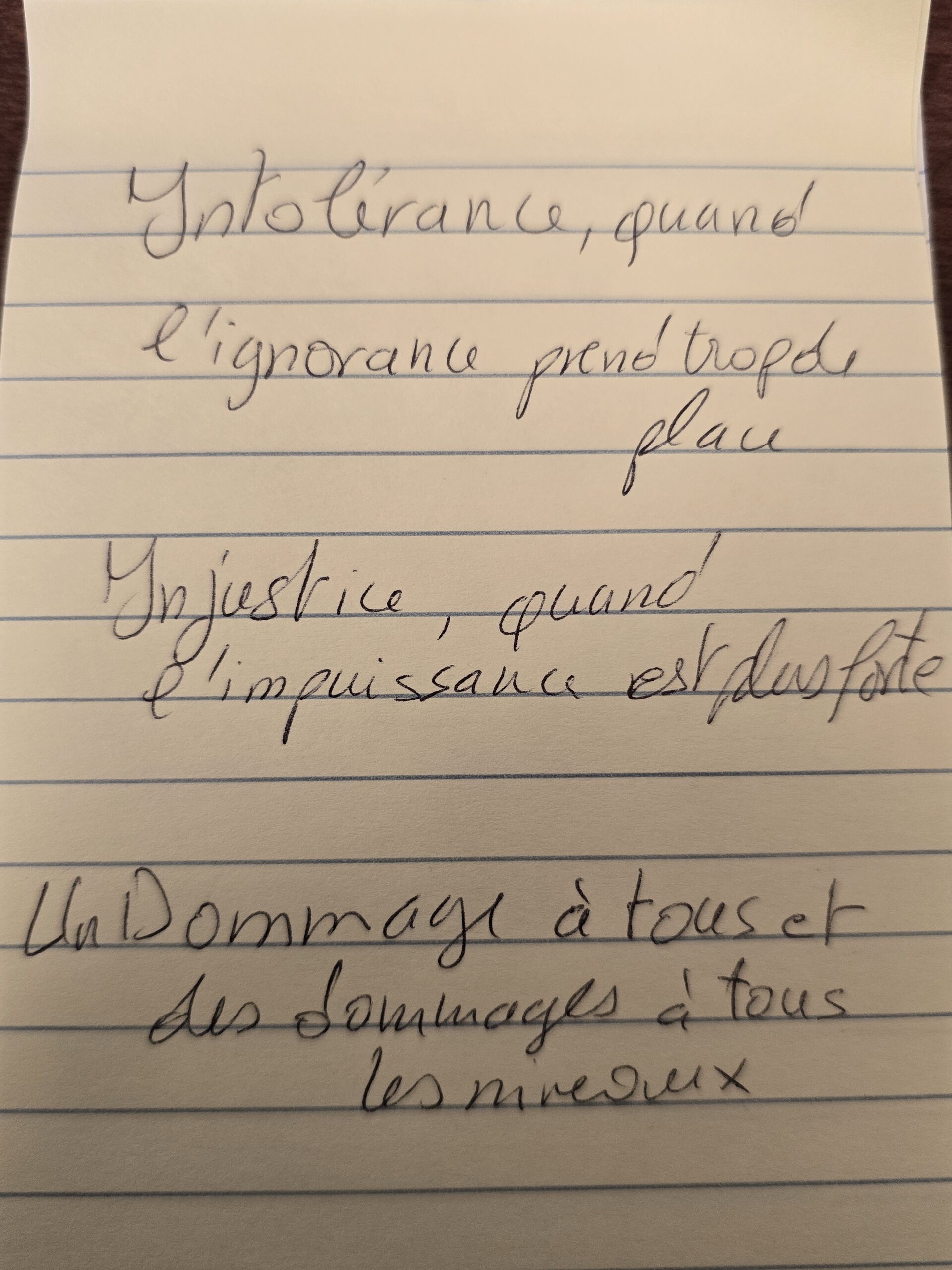 Nous avons invité les participant·e·s à écrire des mots qui leur venaient en tête autour des thématiques de la pièce, puis à en choisir trois ou plus — parmi les leurs et ceux des autres — afin de créer de courts micro-poèmes.