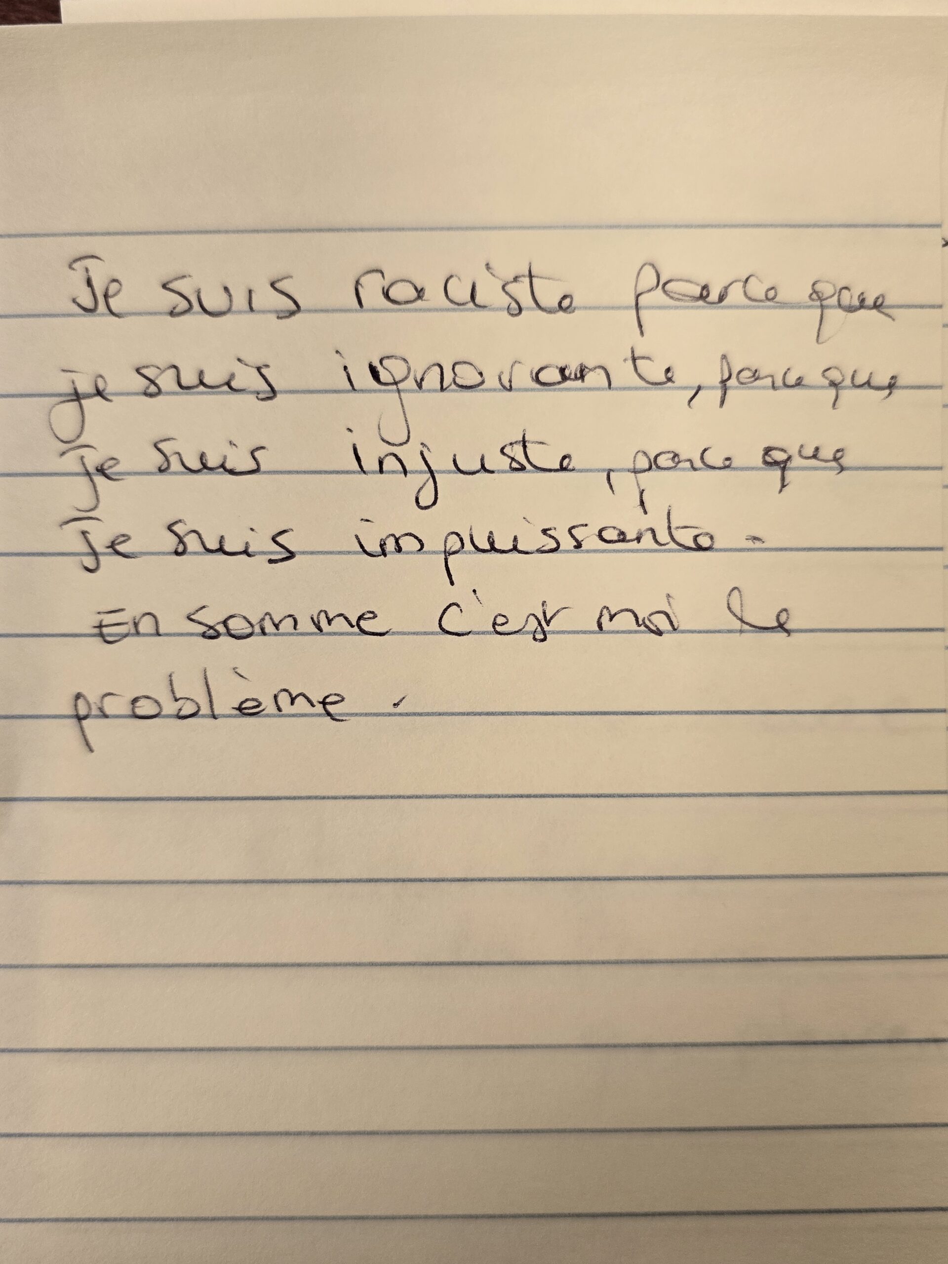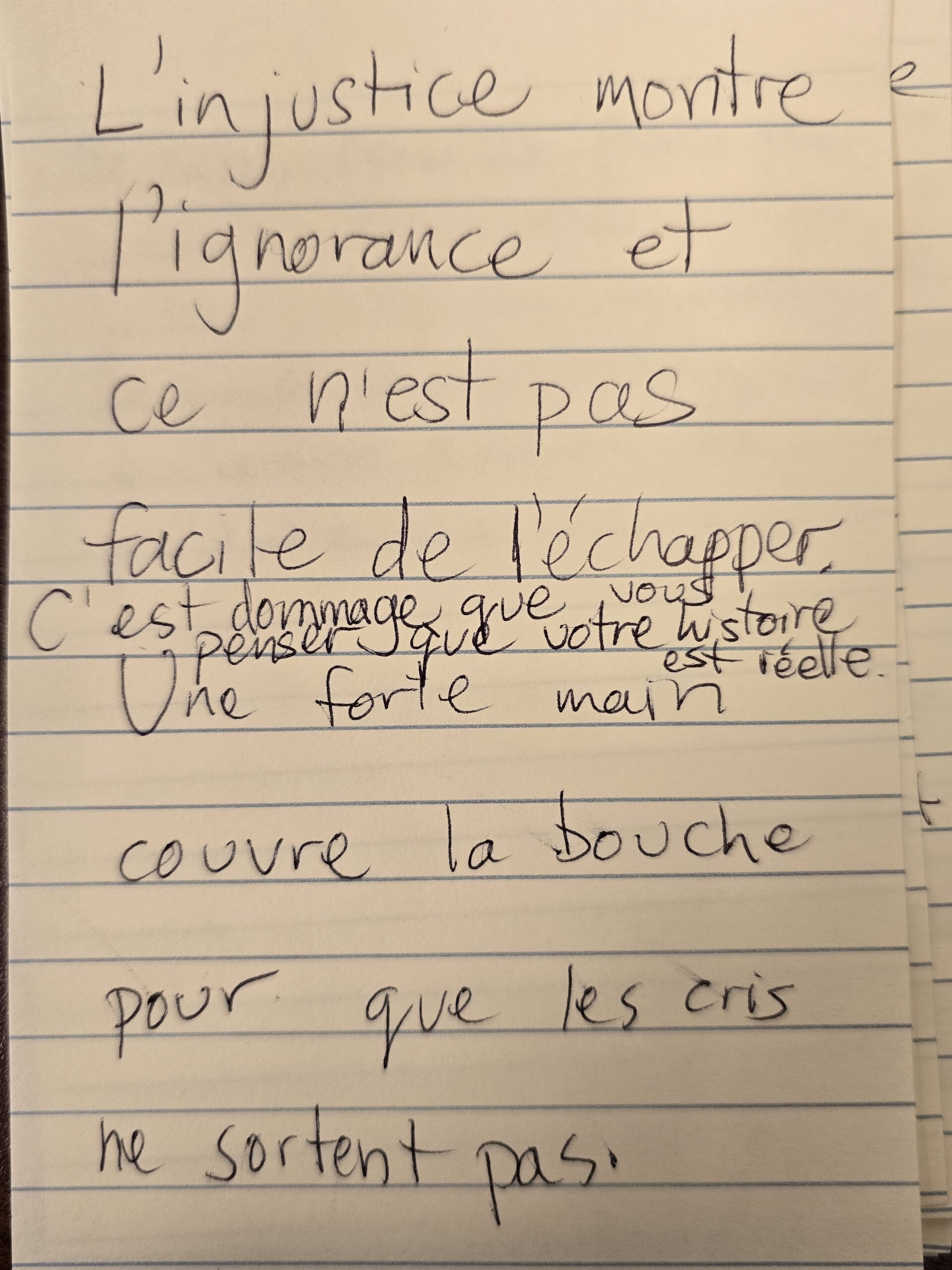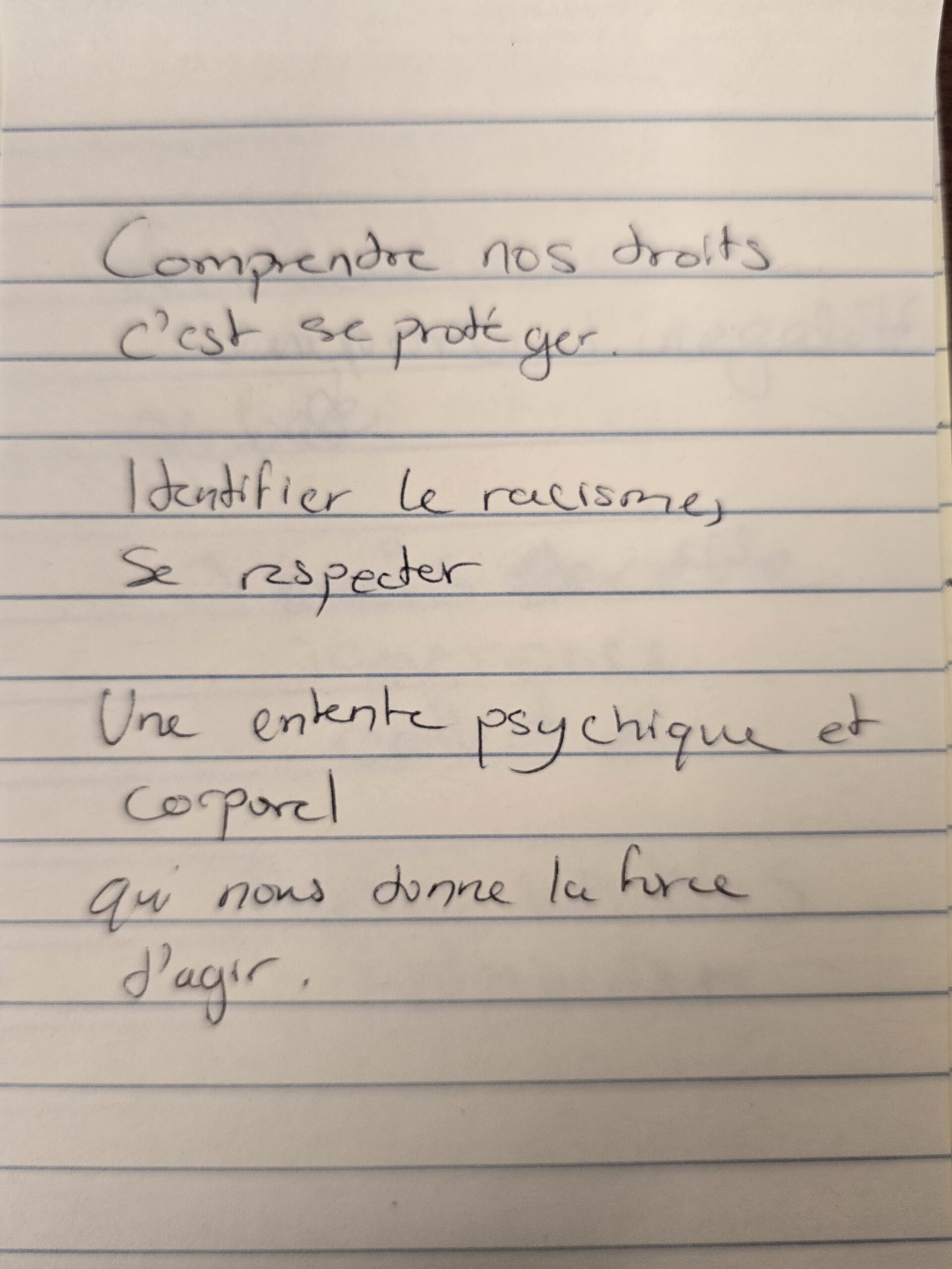 Nous avons invité les participant·e·s à écrire des mots qui leur venaient en tête autour des thématiques de la pièce, puis à en choisir trois ou plus — parmi les leurs et ceux des autres — afin de créer de courts micro-poèmes.