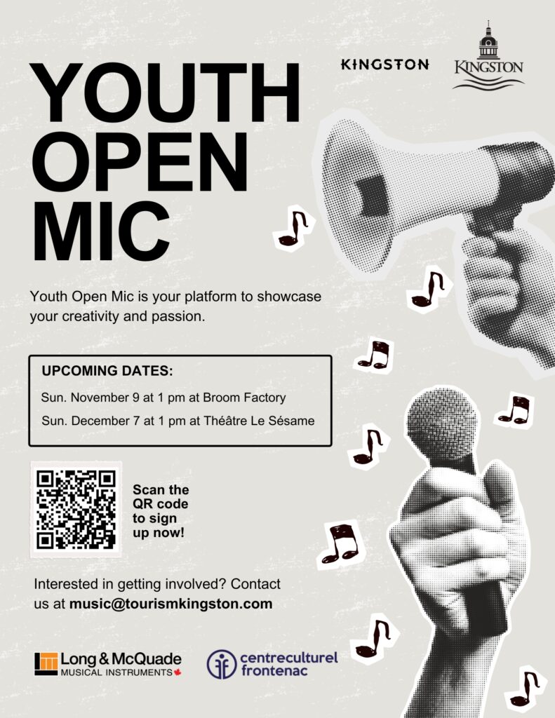 We are thrilled to partner with the Tourism Kingston Music Office to host a bilingual Youth Open Mic at Théâtre Le Sésame on Sunday, December 7 at 1:00 p.m.